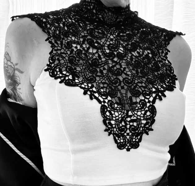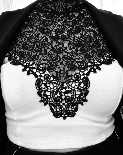 And what about this oh so fancy suit I’m wearing with a lace top. The ensemble is as deceptively fabulous as human perception. What is thought in one moment to be a high neck lace top reveals itself to be a halter top. Versatility and movement show the full spectacularity of the top. It is like the holograph that reveals itself as the viewer moves around it. Remember your vision is partial and fragmented because it is always on the threshold of appearance and disappearance or the known and the unknown as Phillippe has so brilliantly shared with us. Ideas like clothes can be tried on for a new look. Maybe try on a new way of seeing with your next outfit!
